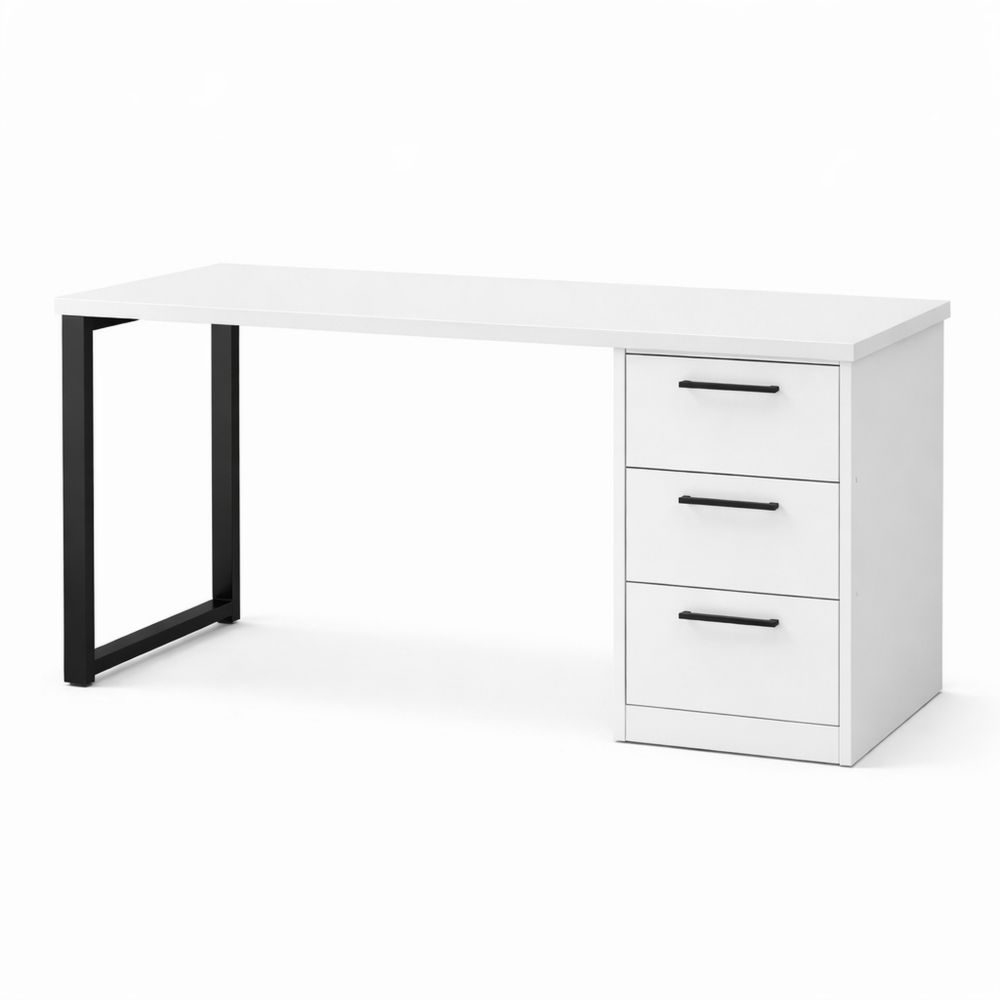 White Particleboard Desk with Black Metal Frame and Three Drawers