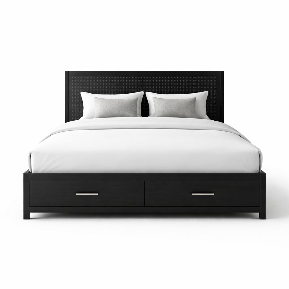 Black Wood Queen Bed with Storage Drawers and Woven Headboard