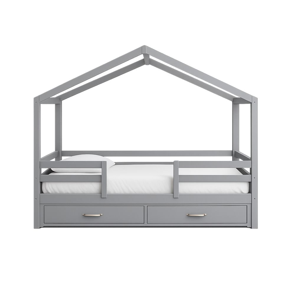 Gray Wood House Bed with Storage Drawers and Guardrails