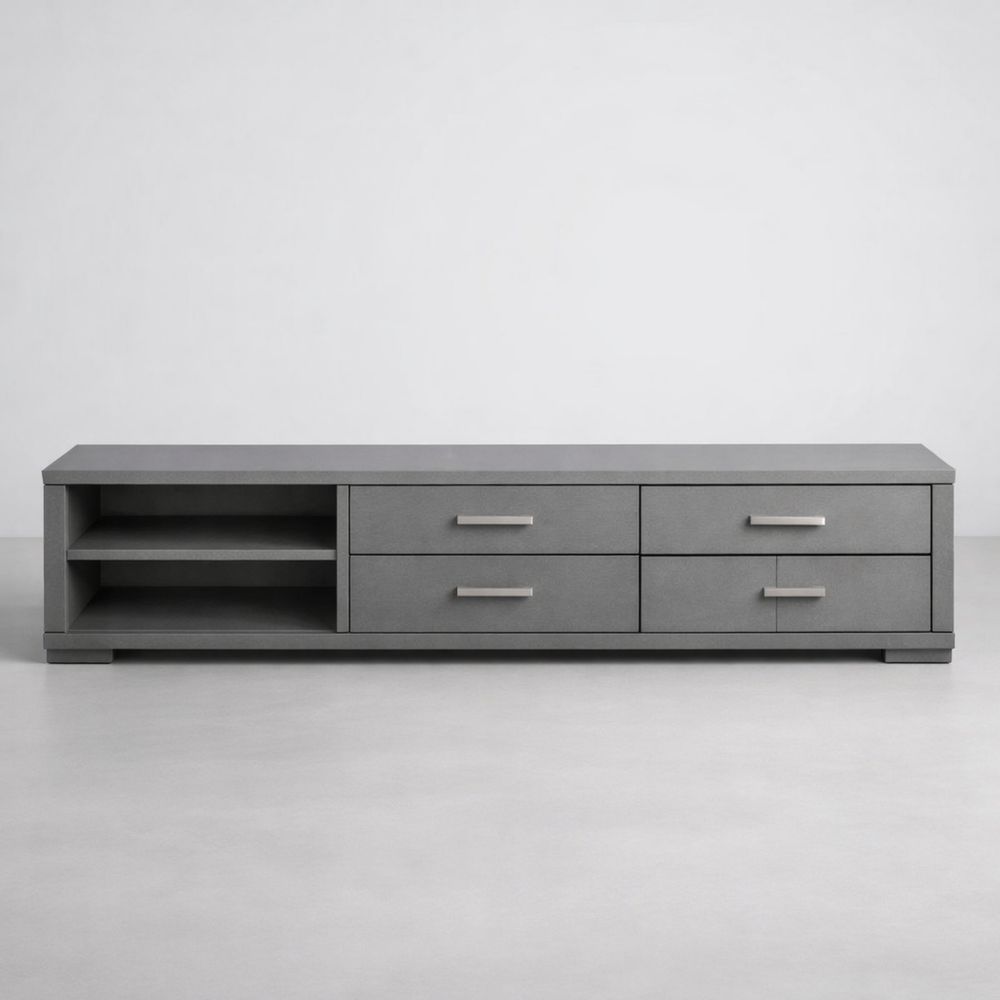 Grey wooden TV cabinet with drawers and storage shelves