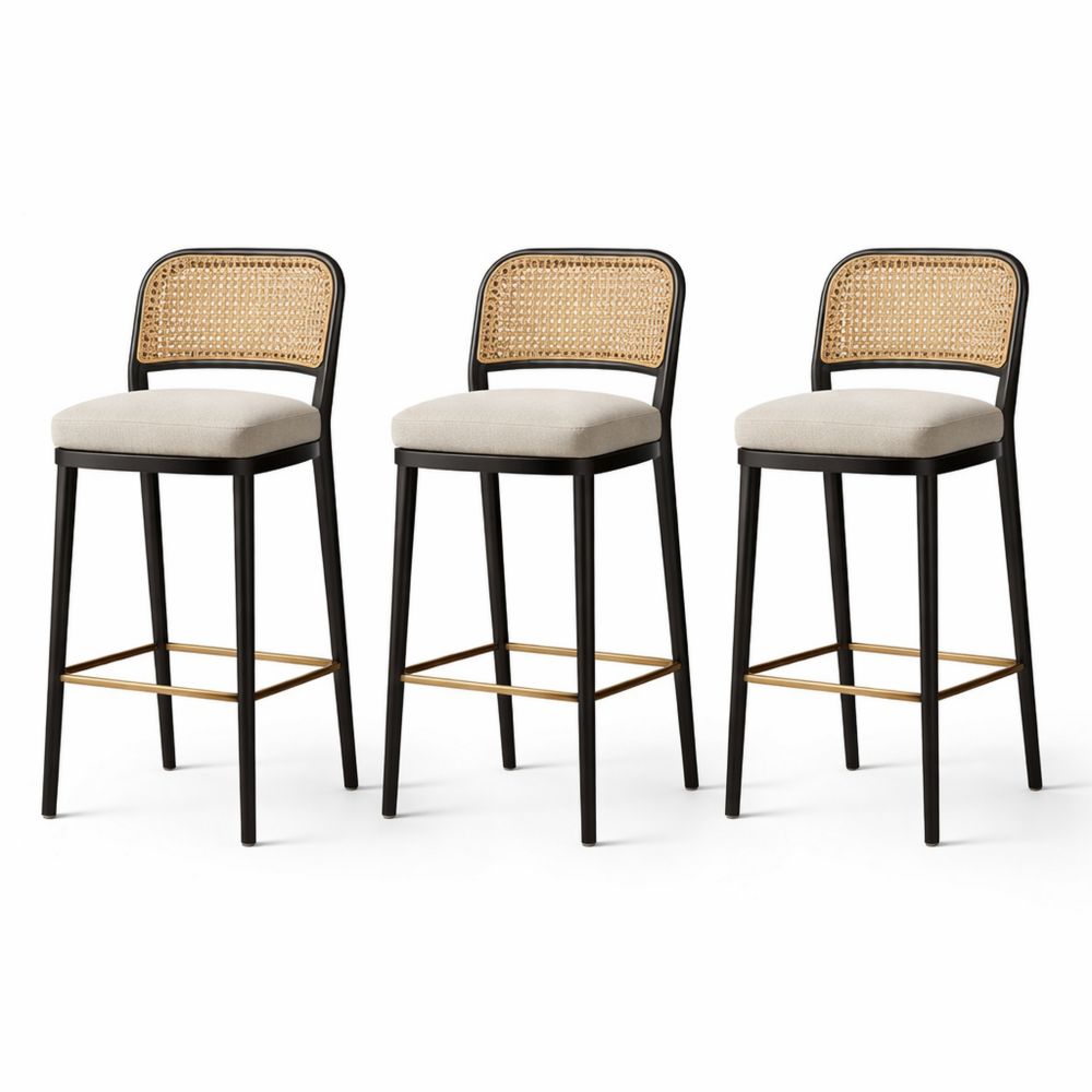 This set includes three bar stools with a steel frame, rattan backrests, and polyester upholstered seats. The frame and footrests are black, and the seats are beige.