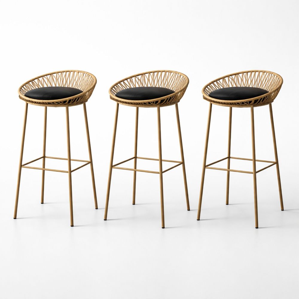 Set of 3 Bar Stools with Rattan Back and Metal Frame Black Cushion