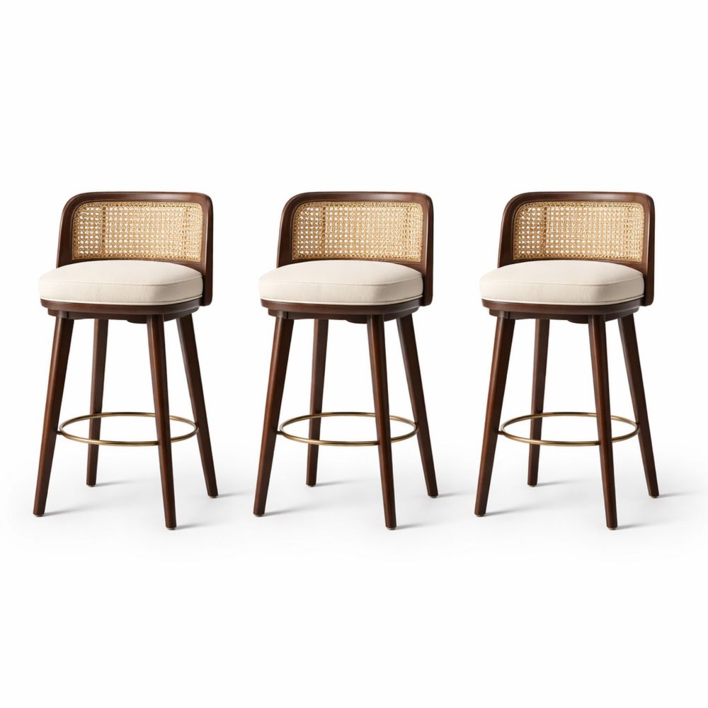 Set of 3 Walnut Swivel Bar Stools with Cane Back and Upholstered Seat