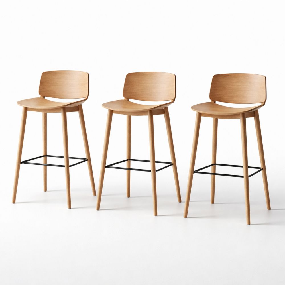 Set of 3 Wooden Bar Stools with Metal Footrest Oak Finish