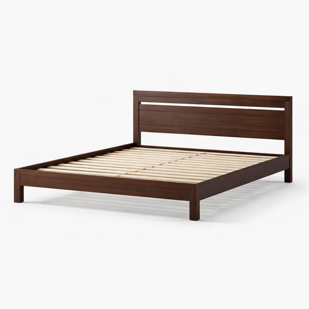 Solid wood bed frame with dark brown headboard