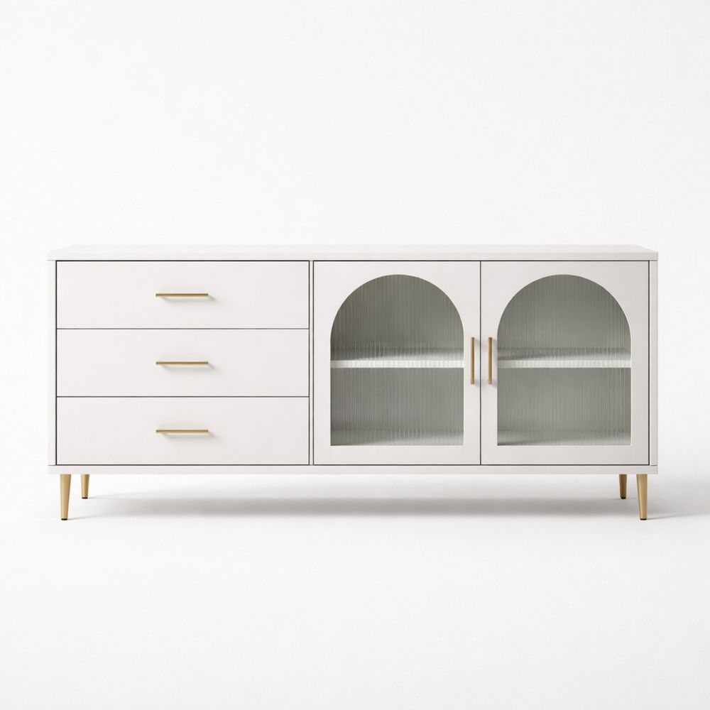 White Wood Sideboard with Glass Doors and Drawers