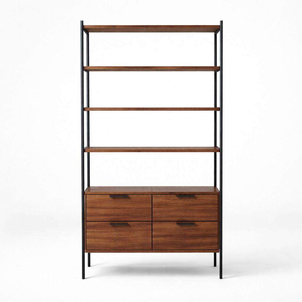 Main material includes walnut wood shelves supported by a black powder-coated steel frame.